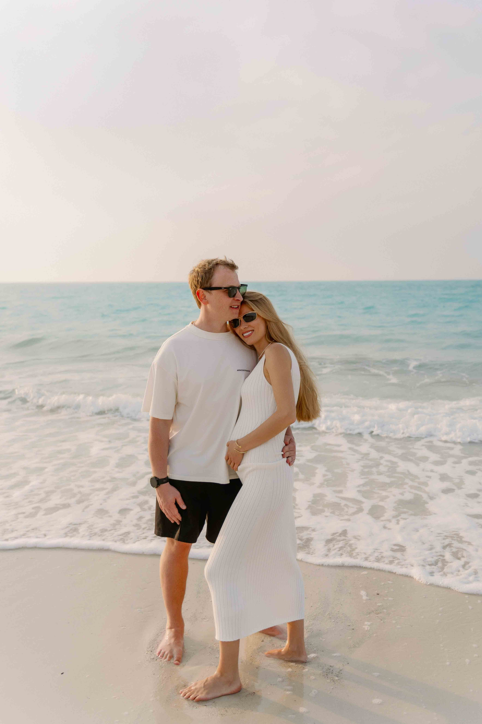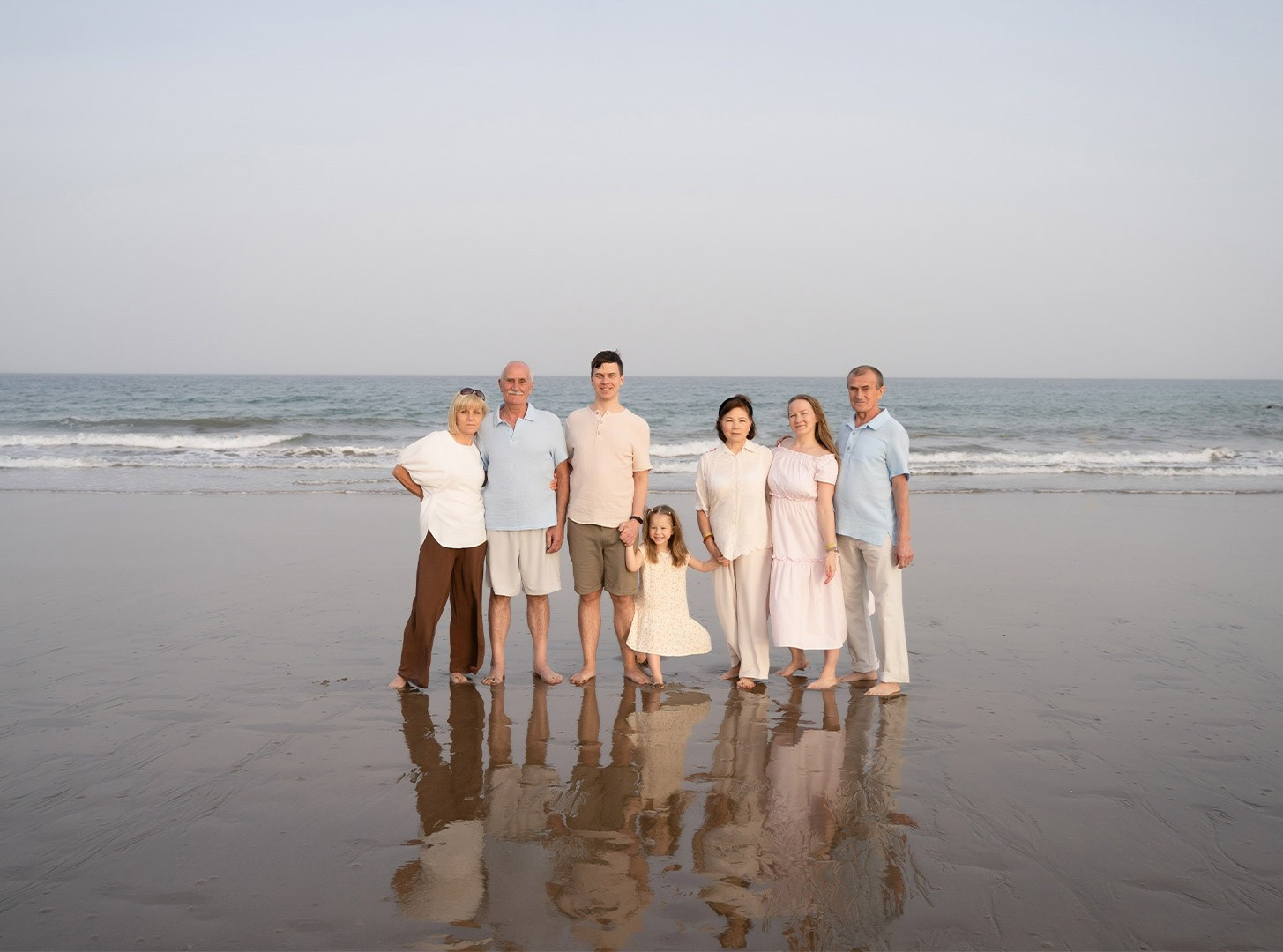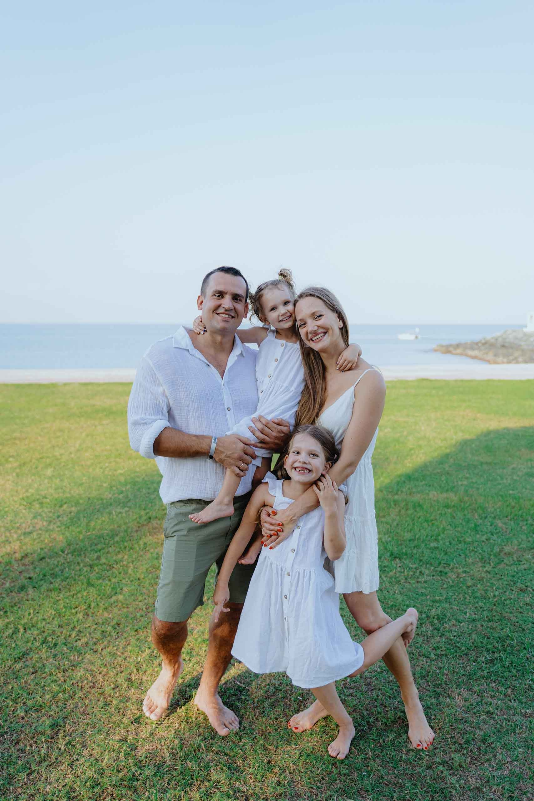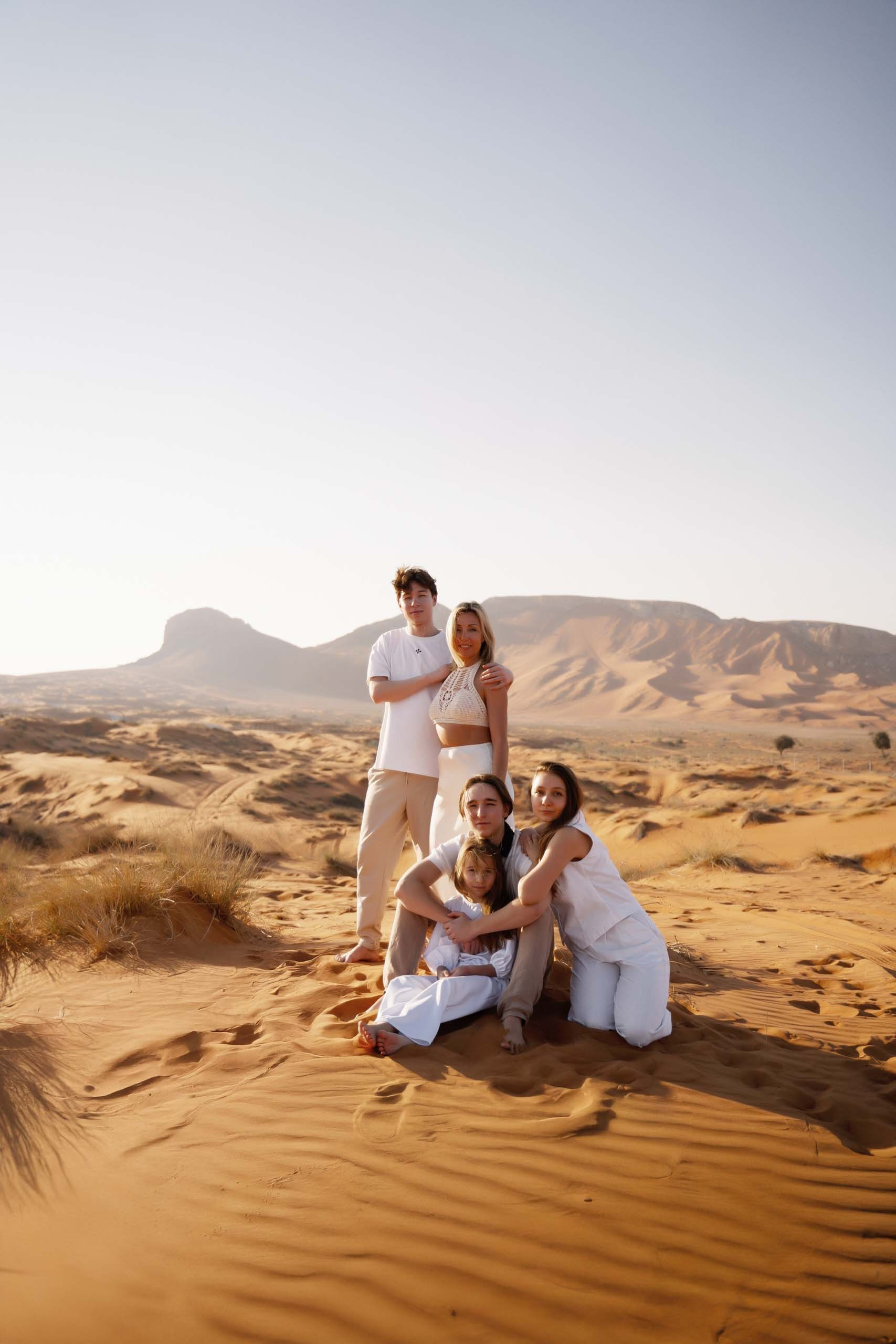 A family photo shoot on the beach, in the desert, in a hotel, or in another beautiful place. You can take your young children to the desert! However, I do not recommend taking your elderly parents to the desert in extreme heat. The best places for a photo shoot are your hotel, a park, or the desert. If you want an oriental touch, consider a park with a mosque in Abu Dhabi.